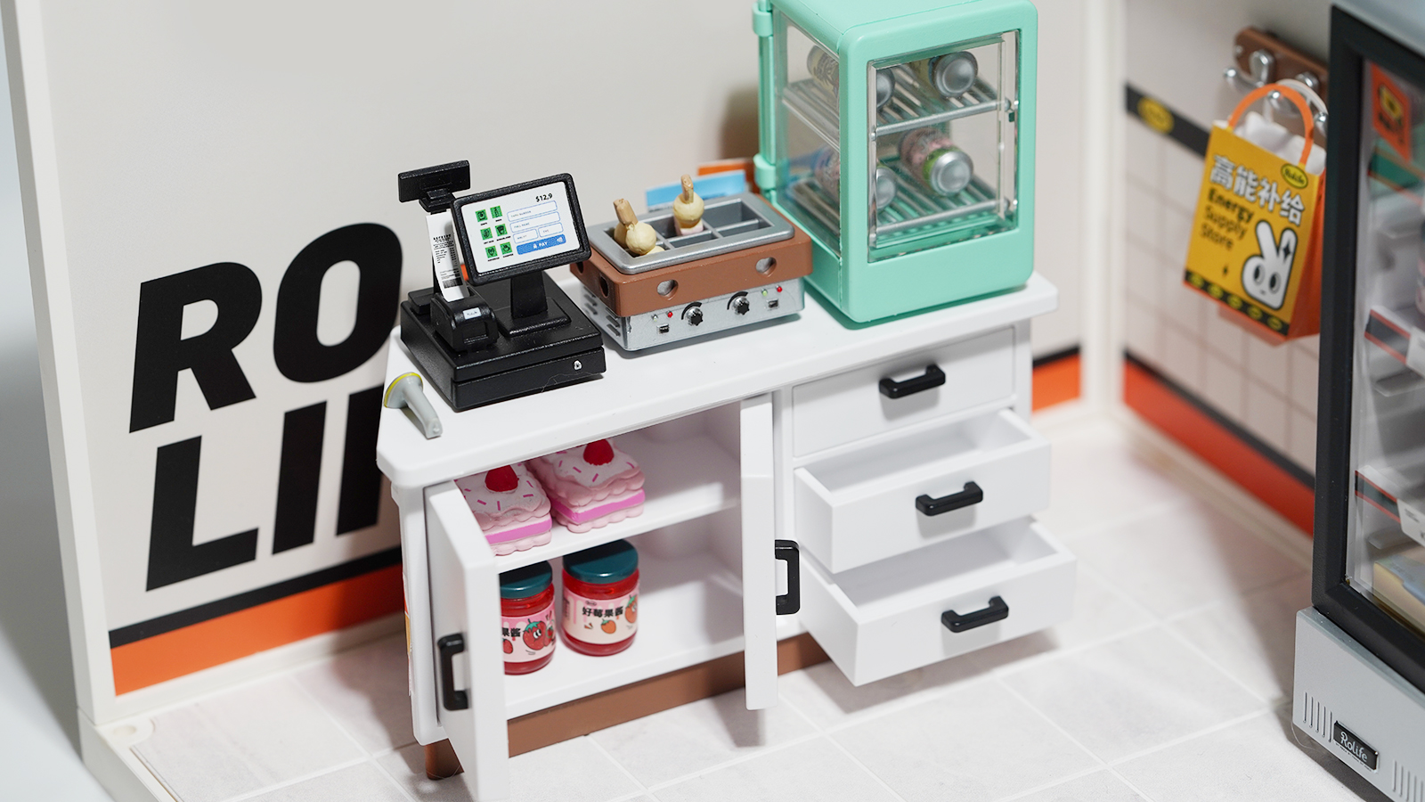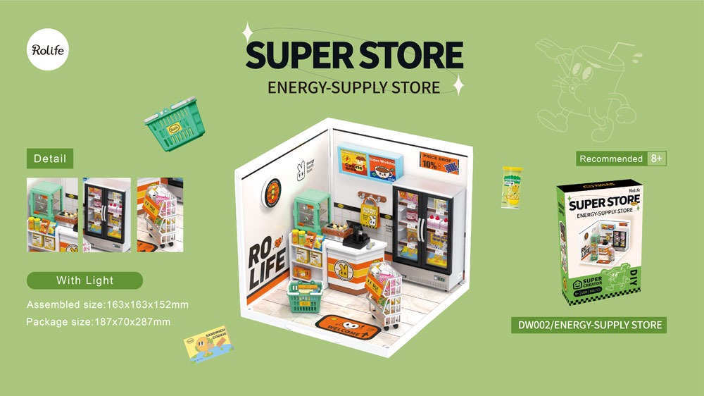 Το Energy Supply Store είναι μια πλαστική DIY μινιατούρα μαγαζιού. Αυτό το αξιολάτρευτο κατάστημα είναι ανοιχτό 24 ώρες το 24ωρο για να φιλοξενεί εργαζόμενους και φοιτητές που ξενυχτούν. Το νόστιμο γκούμπο, τα ποτά και τα γλυκά κέικ είναι πάντα μια θεραπεία για κάθε είδους δυστυχία. Χαμογελάστε! Αύριο θα είναι άλλη μια λαμπερή μέρα! Καλή διασκέδαση στην κατασκευή και το παιχνίδι με αυτό το καταπληκτικό μικροσκοπικό κουκλόσπιτο!